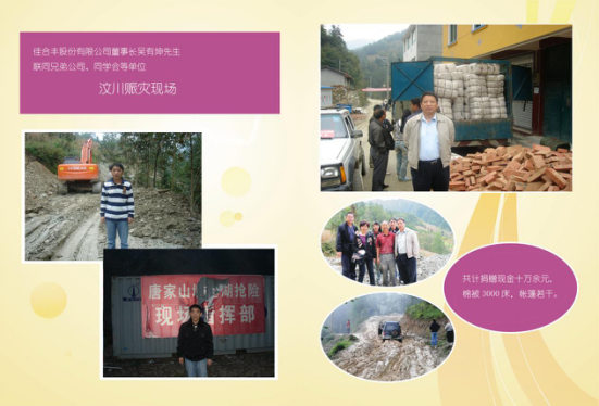 2008年5月12日,汶川发生了举世震惊的大地震,我司紧急动员组织兄弟公司和员工捐款捐物,员工自发捐款超过3万余元,在公司董事长吴有坤先生的主持下,抽出部分公司自有资金,联同兄弟公司和同学、朋友,冒着余震的危险亲赴灾区,一路泥石流、滑坡等风险不断,为避免造成救援通道的拥堵,给救援部队造成不必要的麻烦,他们在当地老乡向导的带领下,走小路,历经艰险将捐赠的钱款和购买的3000床棉被、帐篷等急需的用品送到灾民手中....