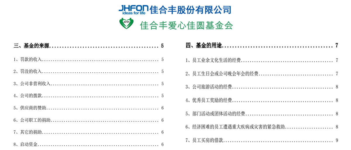 由佳合丰股份有限公司于2010年发起的“爱心佳园”基金会,从公司的盈利中抽取和干部的无偿捐助作为基金来源,旨在针对家庭困难或突遇重大变故的员工、无偿帮助他们共渡难关成立的公司基金组织,自成立以来,已成功支助了6位家庭特别困难的员工,他们有的家庭或遭受严重的自然灾害、或家庭成员重病缠身,入不敷出,基金会核实他们的情况后,一一给予拨款救助,帮助他们重拾信心和希望。目前,基金已累计支出款项45万元,基金会捐助项目已扩展至:
