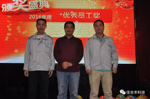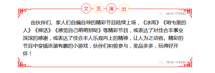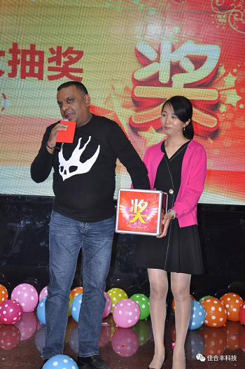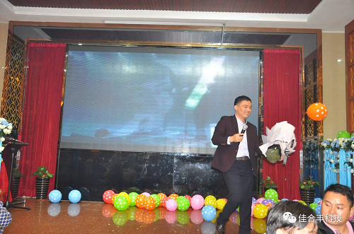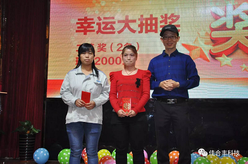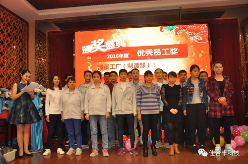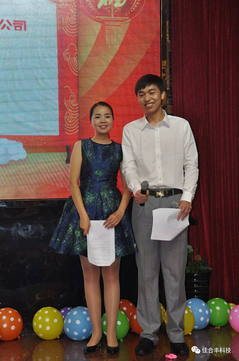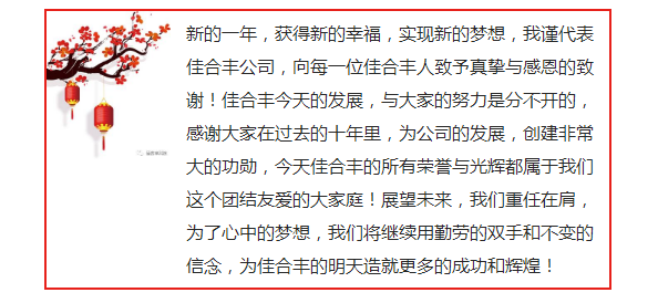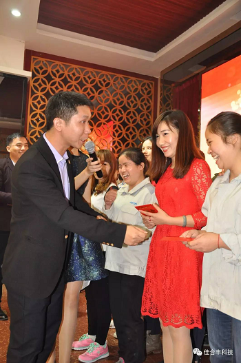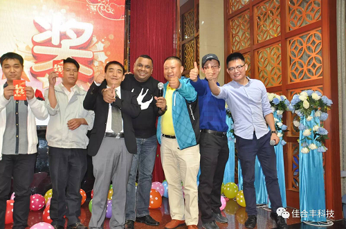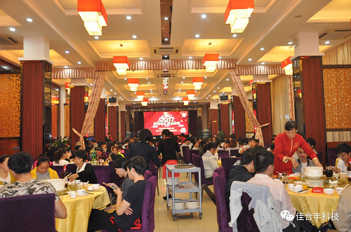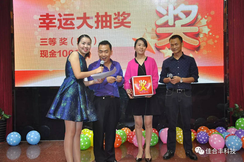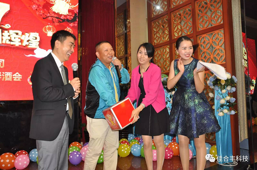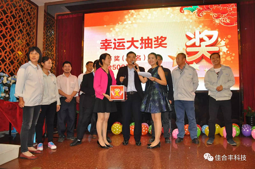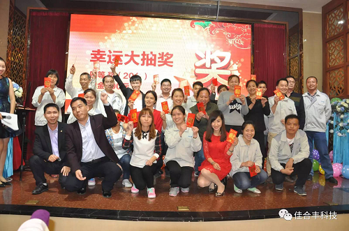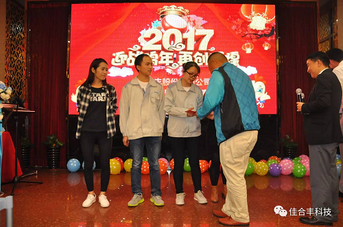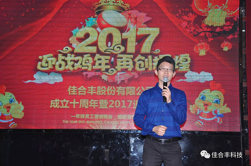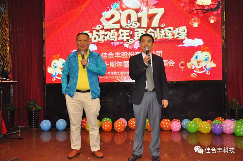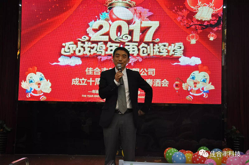 感谢佳合丰股份有限公司董事长吴有坤先生对此次年会的慷慨解囊,为大家准备了丰盛的大餐和奖金。本次新春年会由十年回顾总结大会和优秀员工表彰、文艺表演、幸运大抽奖四大环节构成,严谨与荣耀齐飞,欢乐与祈福并存,体现了年会“携手佳合丰 喜迎鸡年”的主题。