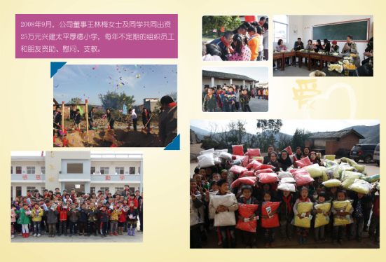 太平厚德小学,位于江西省赣州安远县太平镇,属于农村贫困地区,2008年9月,在我司董事王林梅女士号召下,由佳合丰及王林梅朋友共同出资援建,一直以来,厚德小学成为我司对口捐助的希望小学。大到教学楼的扩建,小到一批批的教学用具,孩子们的饭盒、棉被,我司每年都会不定期的进行捐助,屡次派员工代表驻校支教,经过多年的发展,学校从原来十几名学生扩大到现在的500名学生,让那些读不起书的孩子也有了对美好未来的憧憬,当然孩子们也没有辜负那些关爱他们的好心人士,这几年连续拿得全镇第一名的好成绩,相信在不久的将来,你们的人生更加美好!