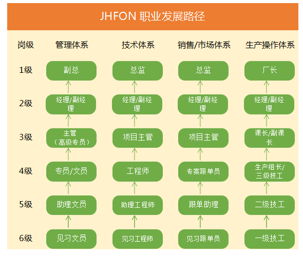 机遇无处不在,能否抓住机遇迎接挑战则取决于你是否做好了迎接给予的准备,每个人的职业生涯取决于你自己,同时,我们JHFON也为每个员工提供多元化的发展方向。